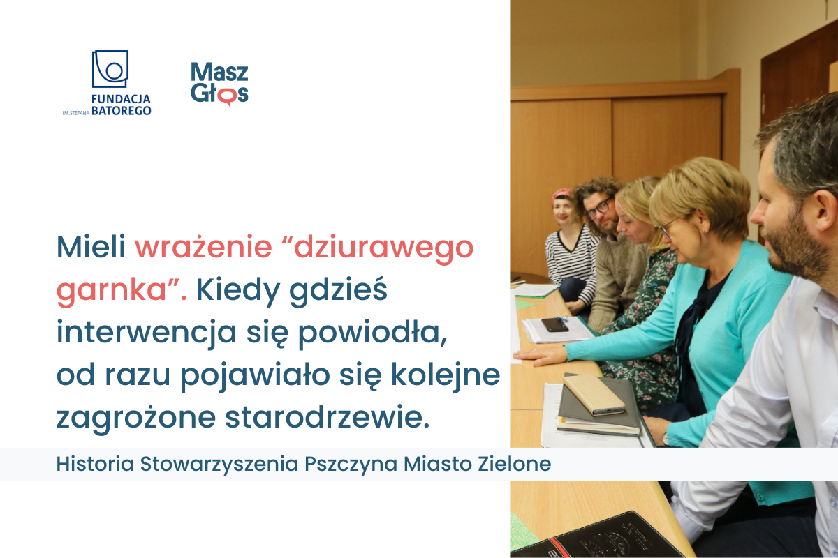 Gdy między Pszczyną a Wisłą Wielką wycięto 250 starych drzew na potrzeby ścieżki pieszo-rowerowej i nie zaplanowano nasadzeń zastępczych, mieszkańcy zrozumieli, jak decydenci traktują zieloną tkankę miasta. Stowarzyszenie Pszczyna Miasto Zielone próbowało interweniować, ale było już za późno. Proces inwestycyjny ruszył, ale Stowarzyszenie zaczęło szukać – w ramach udziału w akcji Masz Głos Fundacji Batorego – bardziej skutecznej metody działania.