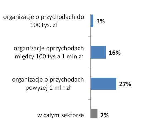 Wspólnym mianownikiem tych wszystkich zależności jest budżet organizacji – im większy, tym częściej stowarzyszenie lub fundacja prowadzi działalność gospodarczą. W 2014 roku wpływy z niej miało 3% stowarzyszeń i fundacji, których przychody nie przekroczyły 100 tysięcy złotych, 16% organizacji o budżecie między 100 tysiącami a 1 milionem i 27% tych o przychodach przekraczających milion złotych.