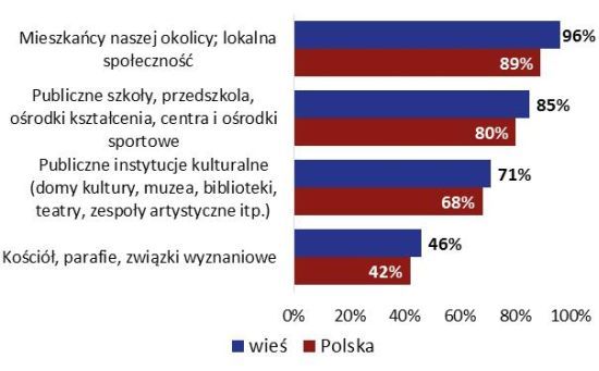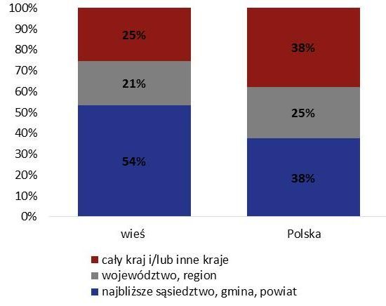 Organizacje z terenów wiejskich często koncentrują się na działaniach na rzecz najbliższego otoczenia. Ponad połowa z nich (54%) nie wykracza ze swoją aktywnością poza obszar najbliższego sąsiedztwa, gminy lub powiatu, a ogólnopolsko działa co czwarta (25%) organizacja wiejska. W skali całego kraju organizacji skupionych tylko na najbliższym otoczeniu jest mniej (38%), więcej zaś działa w ogólnokrajowo (38%).
