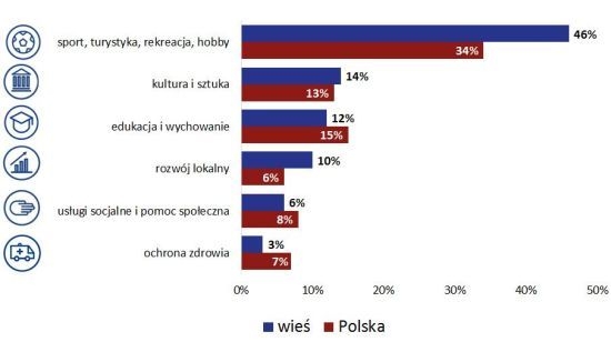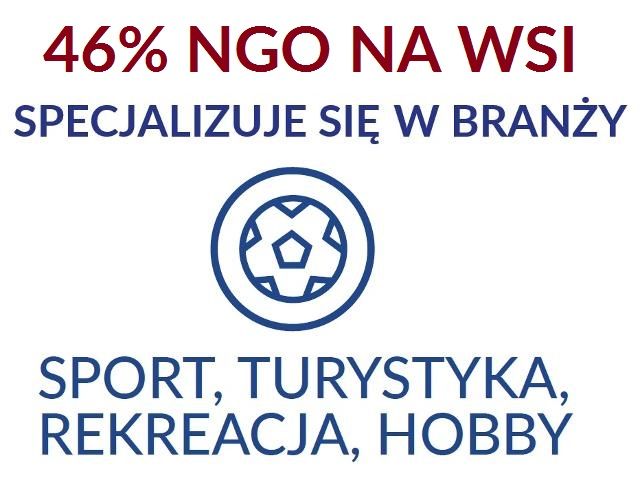 Podobnie jak w całym kraju, organizacje sportowe stanowią na terenach wiejskich dominującą branżę sektora pozarządowego. Jednak dominacja organizacji sportowych na wsi jest w porównaniu do całego kraju ogromna – to niemal połowa (46%) tamtejszych fundacji i stowarzyszeń. Zdecydowanie mniej jest na wsi organizacji kulturalnych (14%), edukacyjnych (12%), zajmujących się rozwojem lokalnym (10%) czy innymi obszarami. Obserwujemy jednak ciekawy trend: odsetek organizacji sportowych zmniejsza się (zarówno na wsi, jak i w skali całego kraju). Jeszcze w 2012 roku stanowiły one na terenach wiejskich ponad połowę sektora pozarządowego. Przybywa natomiast fundacji i stowarzyszeń zajmujących się rozwojem lokalnym, a także usługami socjalnymi i pomocą społeczną.