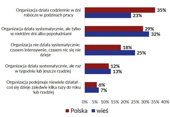 Ze sportowym charakterem wiejskiego sektora pozarządowego współgra akcyjny charakter podejmowanych działań. Na wsi rzadziej niż w miastach zdarza się, aby organizacja działała codziennie, w dni robocze, w godzinach pracy. Zdecydowanie częściej natomiast organizacje te pracują od wydarzenia do wydarzenia: czasami bardzo dużo i intensywnie, a czasami podejmując niewiele działań. Wiąże się to w pewnym stopniu z najczęściej występującą formą aktywności fundacji i stowarzyszeń z terenów wiejskich: jest nią organizowanie różnego rodzaju wydarzeń (zawodów, koncertów, festynów). Takie działania, wymagające właśnie dużej mobilizacji sił i środków od czasu do czasu, podejmuje 71% z nich.