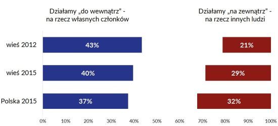 Z silnym nastawieniem na lokalność współgra także wewnętrzna orientacja działań organizacji. Stowarzyszenia i fundacje mogą bowiem kierować swoje działania głównie na zewnątrz, na rzecz innych ludzi lub też do wewnątrz, działając głównie na rzecz własnych członków, sympatyków czy podopiecznych. Ten drugi model nieco częściej jest spotykany w organizacjach z terenów wiejskich. W ten sposób działa 40% z nich, w skali całego kraju natomiast 37%.