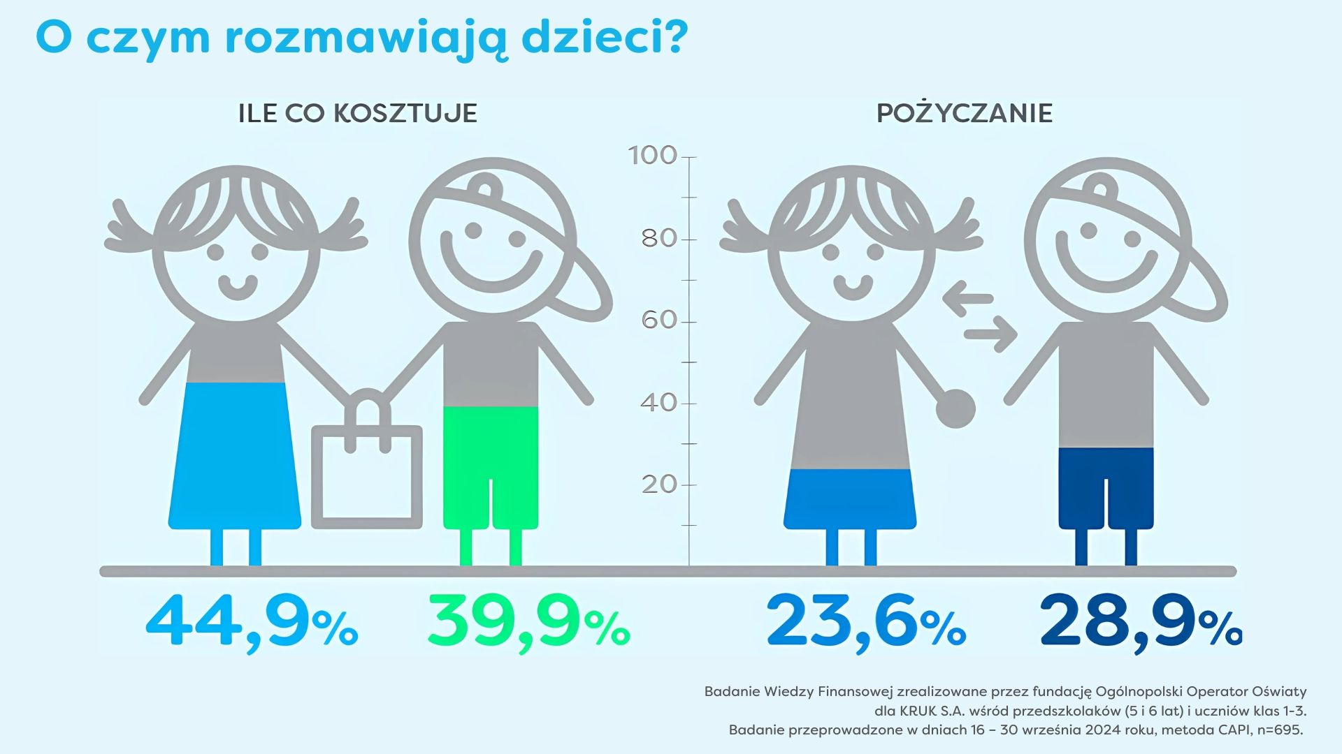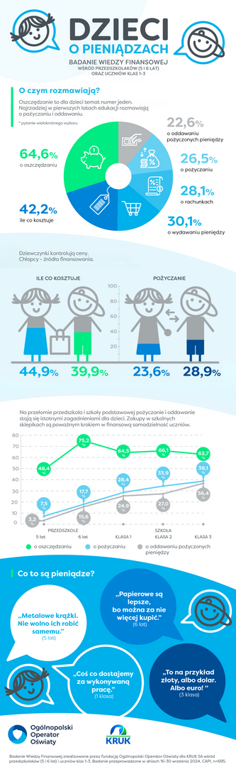 Badanie Wiedzy Finansowej przeprowadzone zostało przez fundację Ogólnopolski Operator Oświaty dla KRUK S.A. wśród przedszkolaków (5 i 6 lat) i uczniów klas 1-3. Badanie przeprowadzone w dniach 16 – 30 września 2024 roku, metoda CAPI, n=695. Badanie jest częścią projektu Uczymy się OOO finansach, realizowanego z okazji Roku Edukacji Ekonomicznej w Polsce.