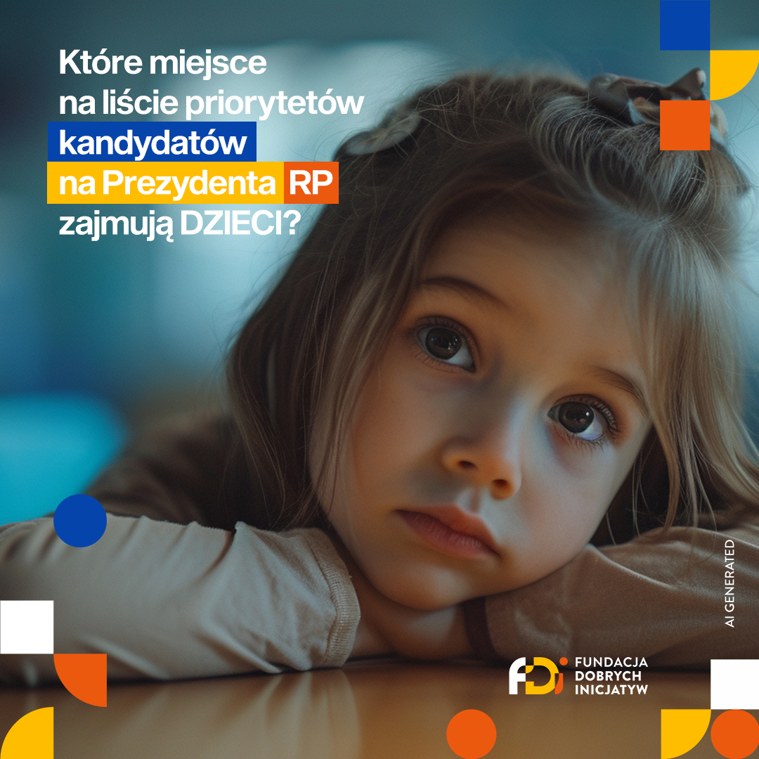 Trwa kampania wyborcza, a wraz z nią debaty w mediach i spotkania w terenie. Kandydaci i Kandydatki na Prezydenta RP objeżdżają Polskę, deklarując troskę o obywateli i przyszłość kraju. Tymczasem, mimo alarmujących statystyk, temat sytuacji dzieci, których rodziny zawiodły, nie pojawia się w rozmowach kandydatów i polityków. Obecnie ponad 77 tys. najmłodszych obywateli, czyli 1% wszystkich dzieci w Polsce, przebywa w pieczy zastępczej, a kolejne 1890 musi czekać na bezpieczny dom pozostając w dysfunkcyjnym środowisku, gdyż brakuje miejsc w rodzinach zastępczych i domach dziecka. Fundacja Dobrych Inicjatyw tym razem u Kandydatów i Kandydatek na Prezydenta RP upomina się o dzieci, których głos dziś nie liczy się przy urnie wyborczej, ale jutro może być głosem nowego pokolenia.