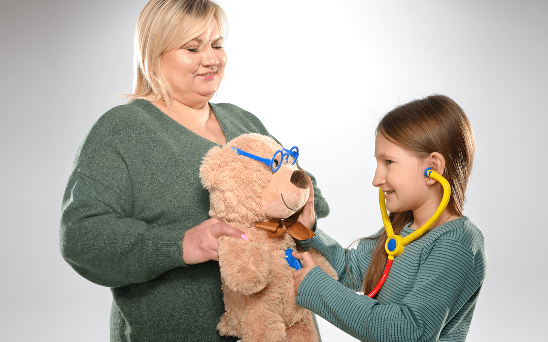 W oswojeniu przedszkolaka z myślą o wizycie pomocna może być zabawa w domu. Warto zaproponować badanie misia bądź lalki, bandażowanie łapek przytulanek, zabawę w robienie zastrzyków i naklejanie plasterków. Dostępne są także świetne poruszające ten temat książeczki dla najmłodszych.