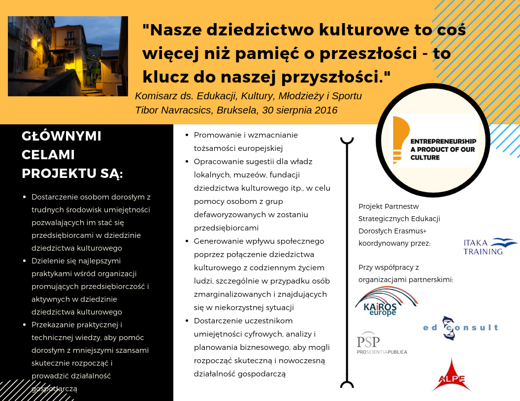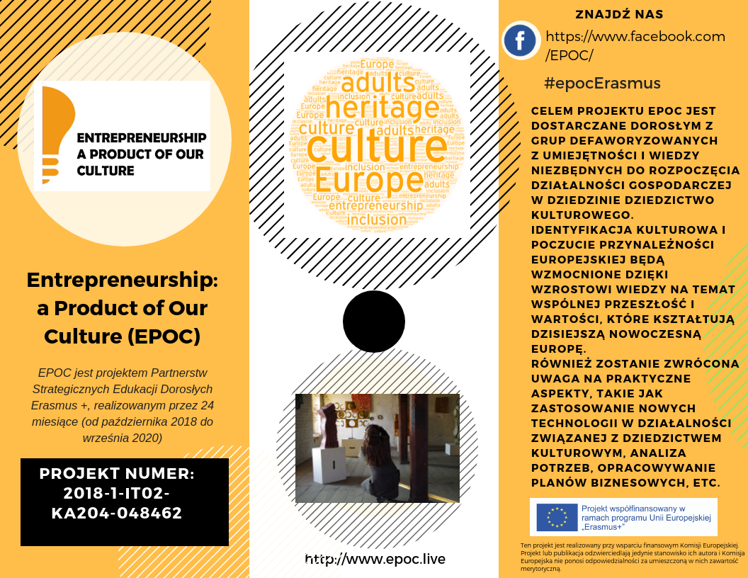 Głównym celem projektu "EPOC: Entrepreneuship a product of our culture" jest dostarczanie umiejętności i wiedzy potrzebnej do rozpoczęcia działalności w sektorze dziedzictwa kulturowego. Jest to obszar, który w wymiarze europejskim ma duże szanse na rozwój przedsiębiorczości, szczególnie wśród dorosłych z grup wykluczanych przez społeczeństwo. Ponad 300 tys. osób jest bezpośrednio zatrudnionych w europejskim sektorze dziedzictwa kulturowego, a 7,8 mln miejsc pracy w Europie ma pośredni związek z tym sektorem, np. w turystyce i pracach budowlanych, usługach pomocniczych takich jak transport, usługi tłumaczenia ustnego, utrzymanie pod względem technicznym i zapewnienie bezpieczeństwa.