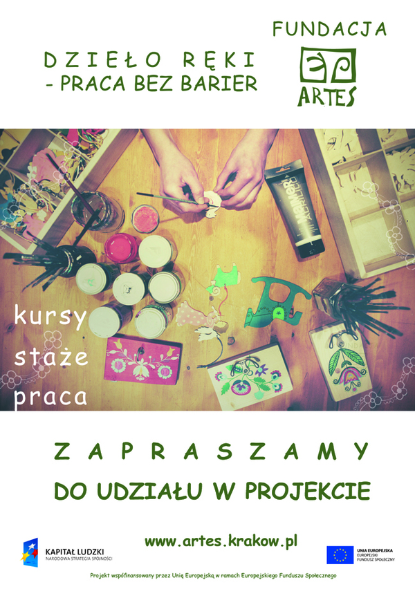 Na początku stycznia tego roku Fundacja Artes ruszyła z projektem – „Dzieło Ręki – praca bez barier” skierowanym do osób niepełnosprawnych z Krakowa i powiatu krakowskiego, które nie pracują, ale są w wieku aktywności zawodowej , które doświadczyły długotrwałej lub ciężkiej choroby somatycznej ,która spowodowała u nich niepełnosprawność, między innymi w obrębie narządu ruchu, i ograniczyła ich zdolność do wykonywania pracy zawodowej.