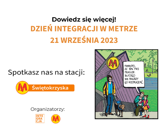 Integracja zaprasza 21 września, w godzinach 8:00 – 11:00 na stację metra Świętokrzyska, gdzie jej edukatorzy będą rozdawać pasażerom metra kolorowy poradnik pt. „Savoir-vivre wobec osób z niepełnosprawnością”, z którego dowiemy się, jak zachować się w kontaktach z osobami z niepełnosprawnością i jak przyjść im ze skuteczną i właściwą pomocą, gdy tego potrzebują oraz czego nie robić, aby ustrzec się przed komunikacyjnymi wpadkami czy faux pas. Ilustracje pochodzące z tego wydawnictwa będą też wyświetlane na stacjach metra i w Galerii Multimedialnej na antresoli stacji Świętokrzyska.