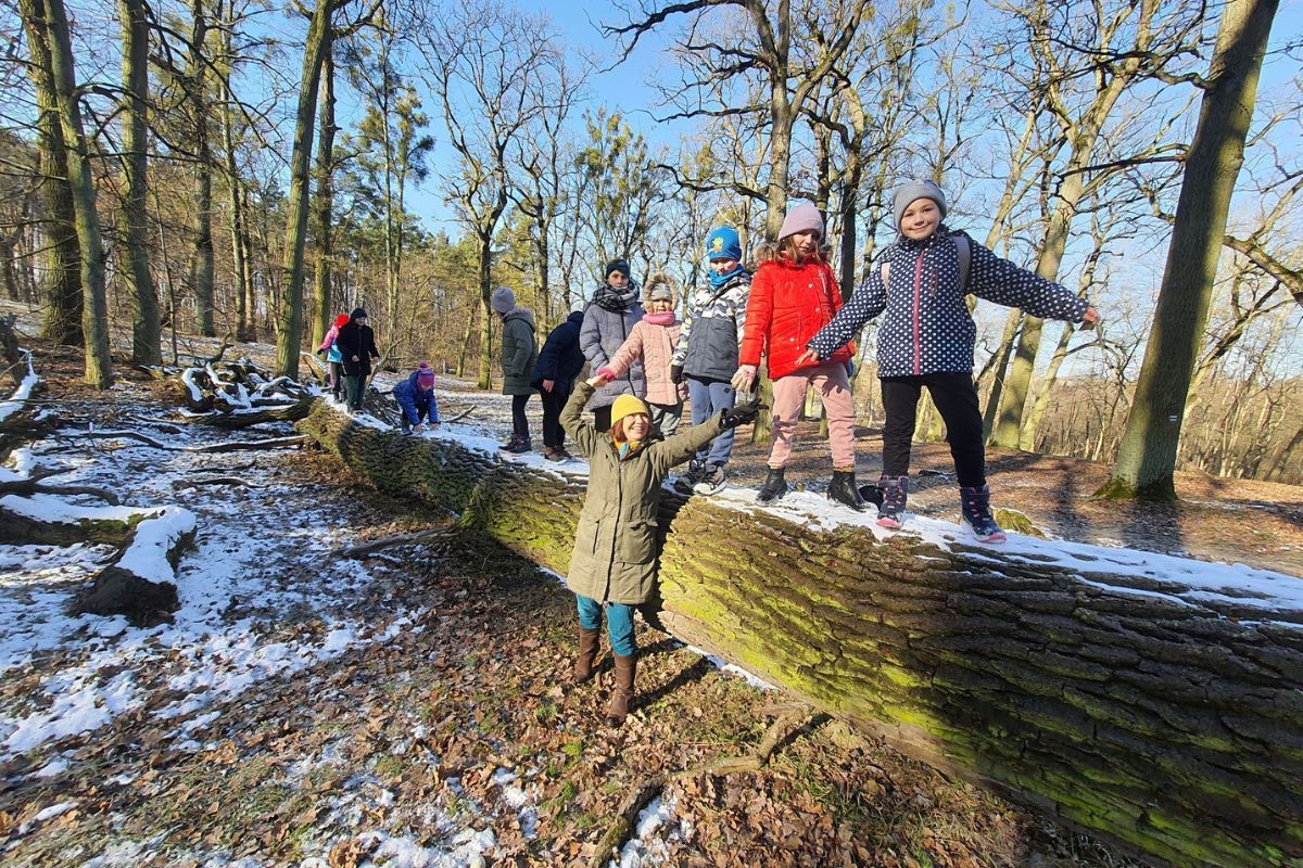 Zdjęcie przedstawia grupę dzieci i dorosłą osobę w zimowym lesie. Dzieci stoją na przewróconym, pokrytym śniegiem pniu drzewa, balansując i trzymając się za ręce. Dorosła osoba stoi poniżej, rozkładając ręce w geście radości. W tle widać więcej osób, drzewa o nagich gałęziach i resztki śniegu na ziemi. Słońce świeci, tworząc jasną i radosną atmosferę.