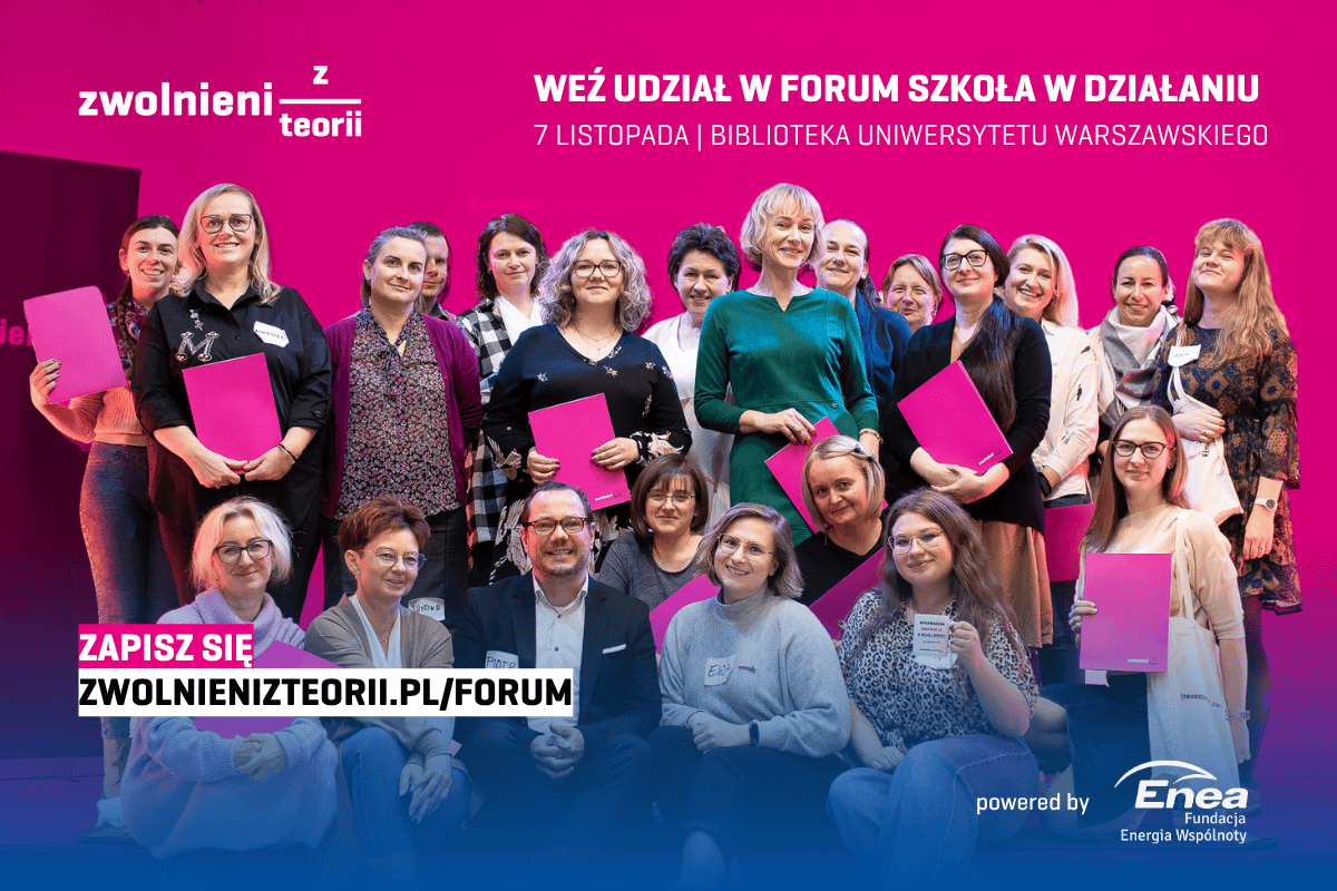 Grupa kilkunastu nauczycielek i nauczycieli pozuje wspólnie do zdjęcia, uśmiechając się do obiektywu. Część z nich trzyma różowe teczki z materiałami. W tle intensywnie różowe tło z logo „Zwolnieni z Teorii” i napisem: „Weź udział w Forum Szkoła w Działaniu – 7 listopada | Biblioteka Uniwersytetu Warszawskiego”. Na dole widoczny napis: „Zapisz się zwolnienizteorii.pl/forum” oraz logo Fundacji Enea z dopiskiem „Energia Wspólnoty”