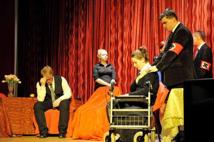 Wydawać by się mogło, że utwór Kruczkowskiego stracił wiele na swej atrakcyjności. Pokazuje przecież losy niemieckiej rodziny z czasów II wojny światowej. Nic bardziej mylnego. Inscenizacja respektuje najważniejsze elementy kompozycji dramatu, dzięki czemu wiele kwestii moralnych brzmi prawdziwie i aktualnie. Na początku mamy wyrazistą prezentację bohaterów uwikłanych w zbrodniczy mechanizm faszystowskiego państwa. W krótkich scenach uczniowie potrafili zaprezentować najbardziej charakterystyczne cechy granych postaci. Dalsza część przedstawienia pokazuje konflikt w rodzinie profesora Sonnenbrucha, który nie godząc się na zbrodniczą politykę Hitlera wybrał dumną samotność. Kamil Tworkowski bardzo dobrą grą potrafił wydobyć tragizm tej postaci, pokazać, że bierność i pogarda dla faszyzmu jest niczym innym, jak przyzwoleniem na zło i degradację ludzkich wartości. Kontrastową wobec postaci uczonego kreacją jest jego dawna asystentka, działaczka antyfaszystowska, uciekinierka z obozu Shoshona Peters. W Niemcach L. Kruczkowskiego jest to komunista Joachim Petrs. Ta innowacja reżyserska (nie jedyna) podyktowana koniecznością (brak aktorów, którzy zagraliby role męskie) nie wpłynęła na jakość tej warstwy dramatu. Anna Owerczuk w roli Shoshony była bardzo przekonująca. Jej racje zawarte w słowach: Ja także znam okropną niemiecką samotność, od czterech dni, odkąd uciekłam z obozu. Samotność we własnym kraju, wśród ludzi mówiących tym samym językiem. (…)Od lat sama siebie skazałam na cierpienie, na śmierć pewniejszą niż życie- żeby walczyć, żeby ratować nas wszystkich! Żeby sprzeciwić się złu! brzmią prawdziwie w czasach odradzających się nacjonalizmów i ekstremizmów .