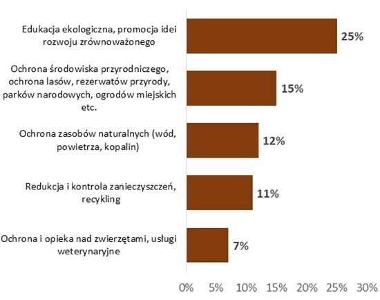 Najpopularniejsze są działania związane z edukacją ekologiczną oraz promocją idei zrównoważonego rozwoju – prowadzi je jedna czwarta (25%) organizacji ekologicznych. 15% z nich chroni środowisko przyrodnicze (lasy, rezerwaty przyrody, parki narodowe), 12% zajmuje się natomiast ochroną zasobów naturalnych (wód, powietrza, kopalin). Nieco ponad jedna dziesiąta (11%) dąży do ograniczenia i kontrolowania zanieczyszczeń, a 7% działa na rzecz zwierząt.