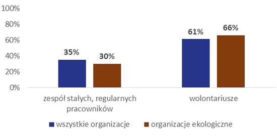 Typową cechą organizacji ekologicznych jest także częstsze korzystanie z pracy wolontariuszy oraz rzadsze zatrudnianie stałych, regularnych pracowników. Ze wsparcia wolontariuszy korzysta dwie trzecie (66%) organizacji ekologicznych, zespół stałych pracowników posiada natomiast mniej niż jedna trzecia (30%) z nich.