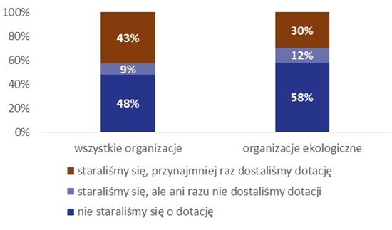 Co ciekawe, organizacje ekologiczne dużo rzadziej niż pozostałe mogą liczyć na finansowanie swoich działań przez lokalne samorządy. Dotację na realizację zadań publicznych od urzędu miasta lub gminy otrzymała w 2015 roku mniej niż jedna trzecia (30%) stowarzyszeń i fundacji zajmujących się ekologią. W całym sektorze pozarządowym z takich środków korzystało w tym czasie 43% organizacji.