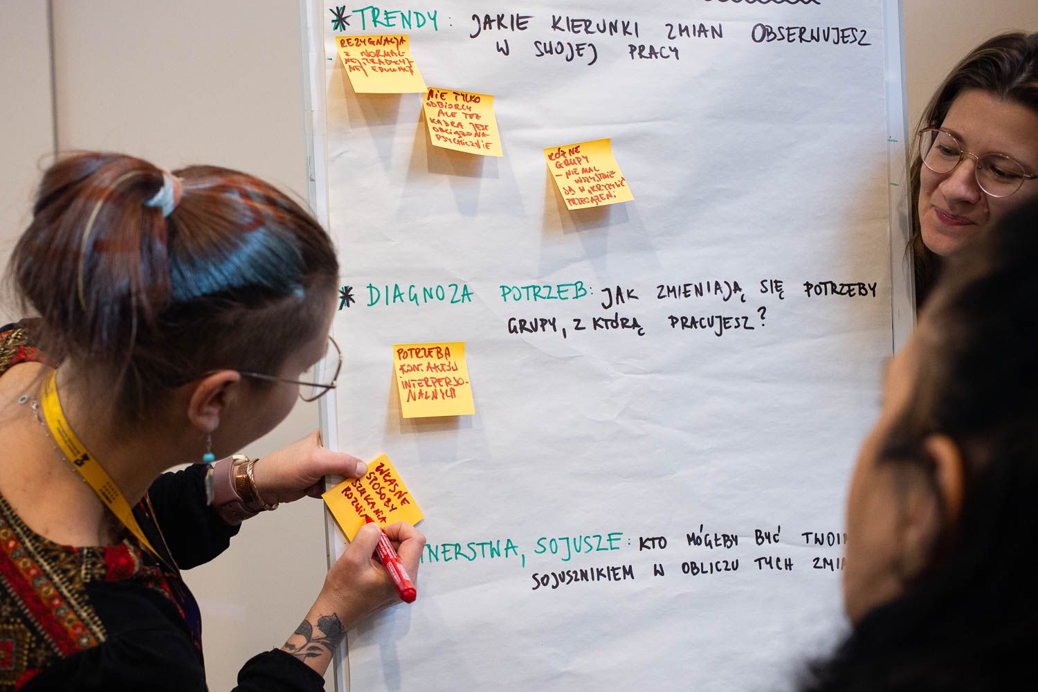 Małe, proste rozwiązania, wynikające ze spotkań z ludźmi i odpowiadające na ich potrzeby, możliwe do powielania w różnych warunkach – tak innowacje społeczne zdefiniowały przedstawicielki Stowarzyszenia na rzecz Spółdzielni Socjalnych, które poprowadziły warsztat właśnie o innowacjach społecznych, jako kierunku rozwoju przedsiębiorstw społecznych. Uczestnicy i uczestniczki warsztatu poznali kilka przykładów innowacyjnych działań i rozwiązań dla pojawiających się problemów społecznych, a także przeszli przyspieszony proces projektowania innowacji społecznej – od określenia trendów, diagnozowania potrzeb, po szukanie rozwiązań dla nich – w trzech obszarach: seniorów, zdrowia psychicznego i wykorzystania nowoczesnych technologii.
