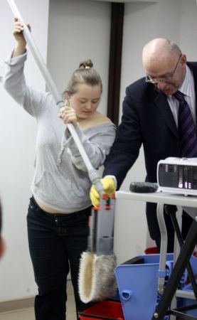 Kolor ściereczki ma znaczenie, kiedy zabieramy się za sprzątanie łazienki, toalety czy ściany. Tego m.in. dowiadują się uczestnicy projektu „Eko-wymiatacze – aktywizacja zawodowa i społeczna osób niepełnosprawnych”. Po szkoleniu teoretycznym dotyczącym sprzątania w budynkach, próbują swoich sił w pracy na profesjonalnym sprzęcie pod okiem specjalisty.