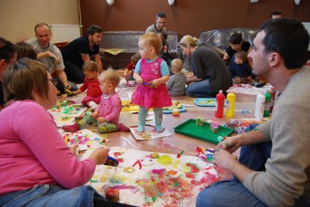 Na kilka chwil w świat wyobraźni mieli okazję przenieść się zarówno dzieci biorące udział w zajęciach, jak i ich rodzice. Wystarczyło przez moment zapomnieć o porządku i czystości, zakasać rękawy, puścić wodze fantazji i po prostu – dobrze się bawić. Do wyczarowania były jesienny pejzaż oraz kartka do pakowania prezentów. W ruch poszły m.in. kawałki brokułów, papryki, mandarynek, liście sałaty, szczoteczka do rąk i farbki. Na koniec spotkania wszyscy mogli pozwolić sobie na odrobinę szaleństwa przy tworzeniu wspólnego portretu z odcisków dłoni i stópek na wielkiej kartce szarego papieru.