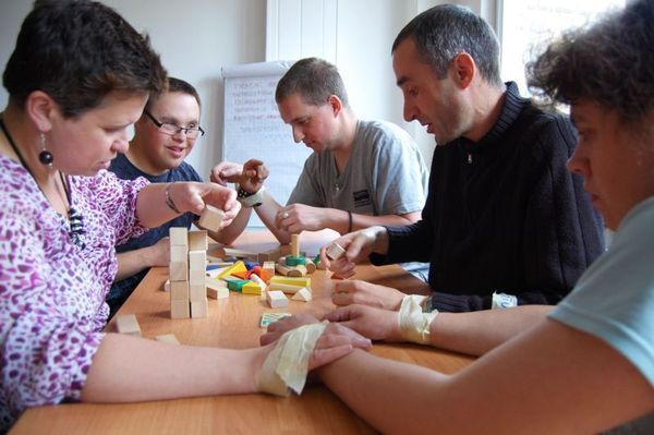 Na sali szkoleniowej ok. 10 osób, podzielonych na dwie grupy. W każdej pracują w duetach. Wszyscy uśmiechnięci, chociaż… mają powiązane ze sobą ręce, w taki sposób, że tylko jedna jest wolna. To musi im wystarczyć, by wspólnie budować wieżę z drewnianych klocków. Utrudnienie paradoksalnie ma pomóc im uczyć się pracy zespołowej, podziału ról, komunikacji.