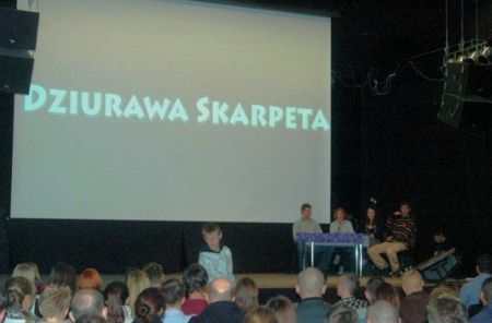 Suwanie krzeseł, rozmowy, powitania słyszane z daleka… dźwięki stukających drzwi… Cisza… Wchodzi Dekalogika z krótkim koncertem hip-hop owym. Kilka chwil później zwięzła zapowiedź Kamila Gęsickiego z Dziurawej Skarpety. – Zapraszamy do obejrzenia filmu.