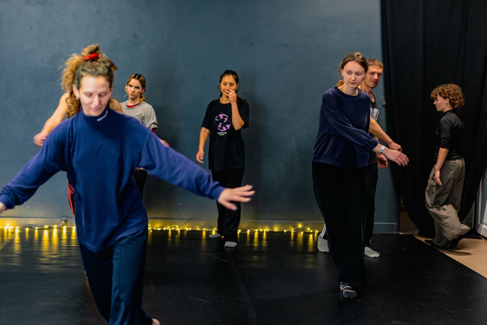 Drugi dzień warsztatów rozpoczął się somatycznym spotkaniem „Move to Connect” Agnieszki Sikorskiej. Poprzez interocepcję – czucie wewnętrzne – uczestnicy i uczestniczki wchodzili w coraz głębszy kontakt z ciałem, ruchem i przestrzenią. Z wewnętrznej uważności rodził się swobodny taniec, który stawał się językiem spotkania i wymiany. W praktykach inspirowanych metodą Feldenkraisa, teorią poliwagalną (opowiadającą o tym, jak układ nerwowy reaguje na stres i poczucie bezpieczeństwa) oraz Body Weather (pracą z ciałem w zmieniających się „warunkach pogodowych” otoczenia) grupa odkrywała radość płynącą z poruszania się razem. Na parkiecie spotkały się różne kultury i tradycje, a finałowy taniec Passing Through połączył indywidualne głosy w jedną opowieść ruchem – o byciu, czuciu i wspólnym rytmie.