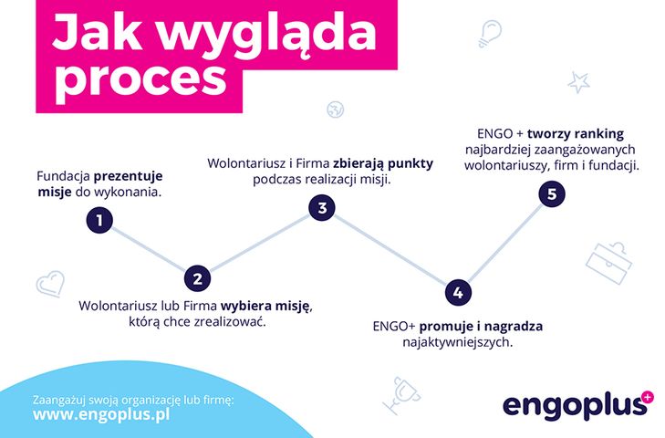 Engo+ – pierwszy taki portal łączący organizacje pozarządowe z wolontariuszami zarówno z osobami prywatnymi, jak i z firmami i ich pracownikami. Portal odpowiada na dwa problemy. Po pierwsze, na zbyt małą ilość rąk do pracy w organizacjach. A po drugie, na brak informacji wśród osób chętnych do pomocy, także firm, o tym jak można się zaangażować.