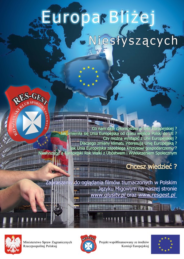 Od stycznia do maja 2011 roku Rzeszowski Klub Sportowy Głuchych RES-GEST realizuje dla osób niesłyszących projekt z środków Komisji Europejskiej zwiększający zainteresowanie aktualnymi wydarzeniami w zakresie integracji europejskiej. W ramach projektu powstaje pakiet filmików tematycznych tłumaczonych na język migowy.