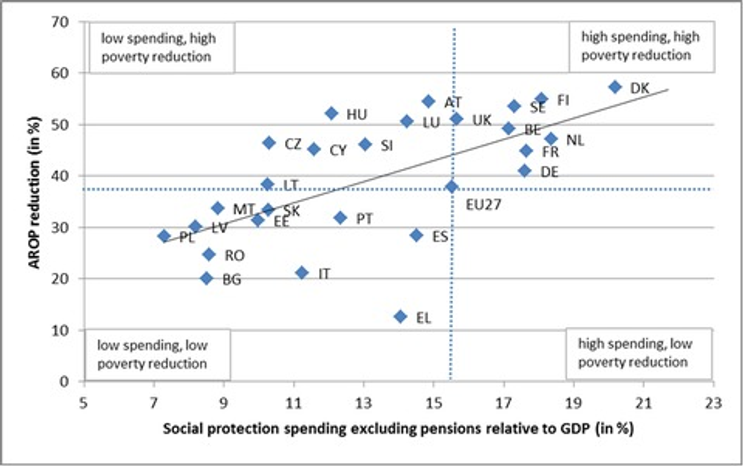 Autorzy Komunikatu Komisji Europejskiej, w którym przedstawione są założenia Pakietu, zwracają uwagę, że kryzys pokazał, jak bardzo kraje członkowskie różnią się pod względem wydolności swoich rynków pracy i systemów wsparcia społecznego. To – zdaniem autorów komunikatu – pokazuje, że wciąż istnieją możliwości poprawy efektywności działań, których celem jest wyrównywanie szans, likwidowanie obszarów wykluczenia i dostarczanie odpowiedniej jakości usług społecznych (przy okazji – proszę zwrócić uwagę na miejsce Polski na poniższym diagramie. Wykres prezentuje, ile poszczególne kraje UE wydają na cele społeczne (bez emerytur) w stosunku do PKB (oś pozioma) i jak przekłada się to na redukcję liczby osób zagrożonych wykluczeniem (oś pionowa).