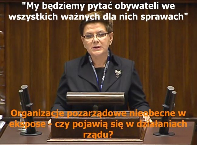 18 listopada 2015 r., przed głosowaniem o votum zaufania dla nowego rządu, wysłuchaliśmy exposé premier Beaty Szydło. Trzeci sektor nie pojawił się w wystąpieniu. Czy pojawi się w działaniach rządu? - My będziemy pytać obywateli we wszystkich ważnych dla nich sprawach – deklaruje Beata Szydło.