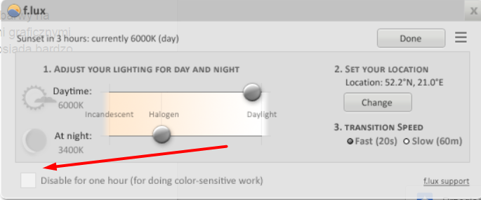 Z pomocą w walce ze szkodliwą elektroniką przychodzi, nomen omen, inne rozwiązanie technologiczne. f.lux to aplikacja, która zmienia zakres emitowanego światła przez nasz komputer. Duża zaletą programu jest to, że działa samoczynnie. Dzięki określeniu naszej lokalizacji, aplikacja wie, kiedy należy zmienić światło emitowane przez ekran eliminując z niego niebieski zakres fal. Objawia się to zmianą świecenia naszego ekranu na bardziej pomarańczowy. O ile na początku może to delikatnie drażnić, to przyzwyczajenie do niego zajmuje dosłownie odrobinę dobrej woli i kilku godzin przepracowanych z właczonym f.luxem. Po kilku dniach zaczniemy zapominać o zmianie temperatury barwnej naszego ekranu, a nasz organizm nam podziękuje.