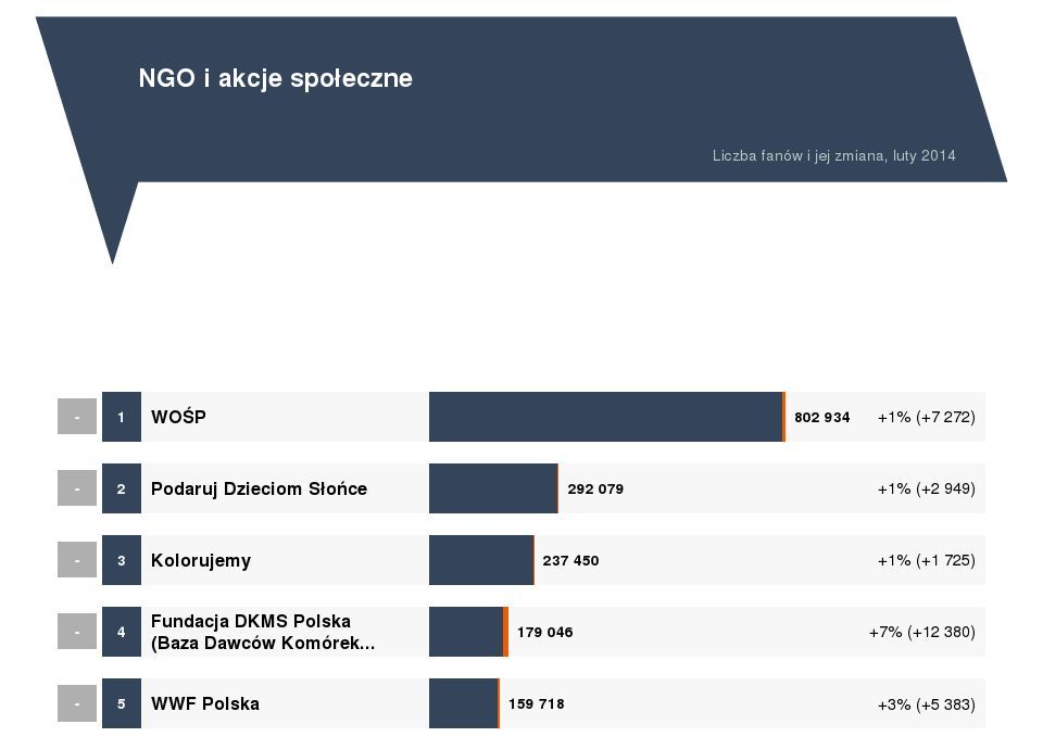 Zdziwienia nie budzi podział miejsc w kategorii najpopularniejszych fanpage’y wśród wszystkich organizacji pozarządowych obecnych w tej sieci społecznościowej. Na pierwszych pozycjach w najbliższych miesiącach trudno o jakiekolwiek zmiany. Najwięcej fanów na koniec lutego br. gromadził fanpage WOŚP – 803 tys. fanów, za nim znalazła się strona Podaruj Dzieciom Słońce – 293 tys. fanów, a także Kolorujemy – 237 tys. fanów.