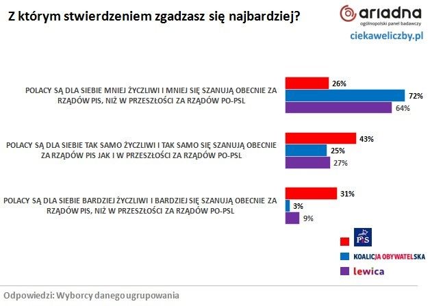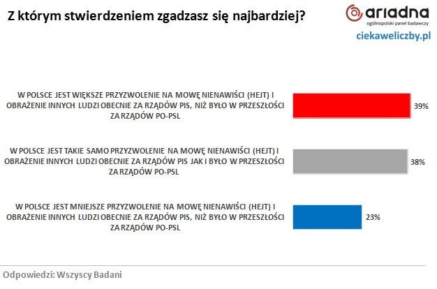 Prawie połowa Polaków (48%) jest zdania, że za rządów PiS jesteśmy dla siebie mniej życzliwi i mniej się szanujemy, niż miało to miejsce za rządów PO-PSL. Więcej Polaków (39%) uważa, że za rządów PiS panuje większe przyzwolenie na mowę nienawiści (hejt) i obrażenie innych ludzi niż za rządów PO-PSL (23%) – tak wynika z badania przeprowadzonego dla serwisu ciekaweliczby.pl na panelu Ariadna.