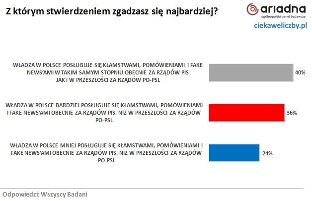 Badanie pokazuje ponadto, że większa część Polaków (36%) uważa, że władza w Polsce bardziej posługuje się kłamstwami, pomówieniami i fake newsami obecnie za rządów PiS, niż posługiwała się w przeszłości za rządów PO-PSL. Przeciwnego zdania jest 24% badanych, natomiast 40% uważa, że jest tak samo – niezależnie od tego, czy rządzi PiS czy rządziło PO-PSL.
