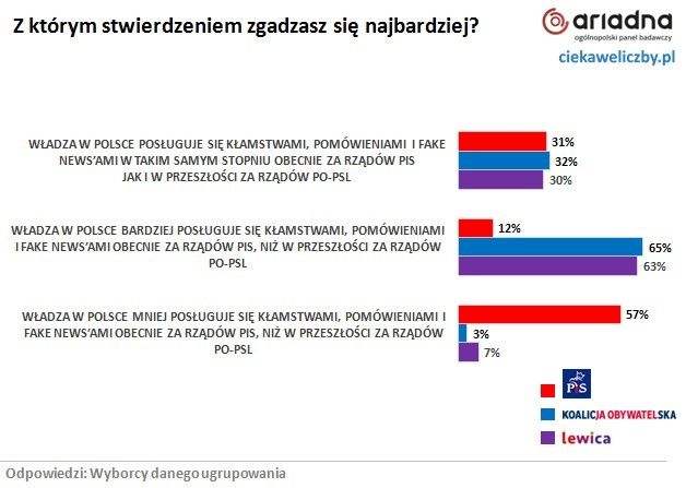 Analiza odpowiedzi wyborców poszczególnych ugrupowań pokazała, jak podzielone jest społeczeństwo. Podczas gdy większość elektoratu Koalicji Obywatelskiej (65%) i Lewicy (63%) uważa, że to obecna władza bardziej posługuje się kłamstwami, pomówieniami i fake newsami, większość wyborców PiS (57%) jest zdania, że jest dokładnie odwrotnie.