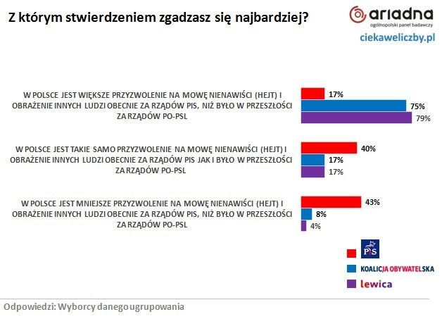 Podobnie jak w poprzednich pytaniach, odpowiedzi zwolenników opozycji oraz partii rządzącej istotnie się od siebie różniły. Przeważająca część wyborców Koalicji Obywatelskiej (75%) i Lewicy (79%) uważa, że obecnie za rządów Prawa i Sprawiedliwości jest również większe przyzwolenie na mowę nienawiści (hejt) i obrażanie innych ludzi niż w przeszłości za rządów PO-PSL. Uważa tak nawet 17% wyborców PiS, ale już 43% jest zdania, że teraz to przyzwolenie jest mniejsze niż w przeszłości.