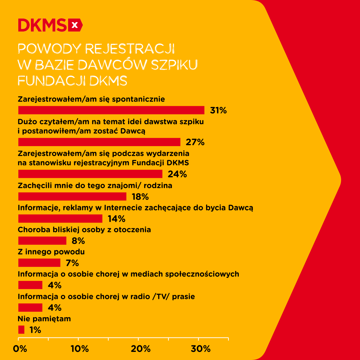Żeby zostać potencjalnym dawcą szpiku, należy wykonać jeden prosty krok – zarejestrować się! Faktyczni dawcy szpiku, zapytani o powody dołączenia do bazy Fundacji DKMS najczęściej odpowiadali, że zarejestrowali się spontanicznie – 31 proc. 27 proc. respondentów przyznało, że dużo czytało na temat idei dawstwa i to skłoniło ich do rejestracji. Na trzecim miejscu znalazła się spontaniczna rejestracja na stoisku Fundacji DKMS podczas jakiegoś wydarzenia – 24 proc. Prawie co piątego dawcę do rejestracji zachęcili znajomi lub rodzina – 18 proc. Dla 4 proc. respondentów impulsem była informacja o osobie chorej w mediach społecznościowych. W przypadku tej grupy Facebook był najczęstszym źródłem informacji – 76 proc.
