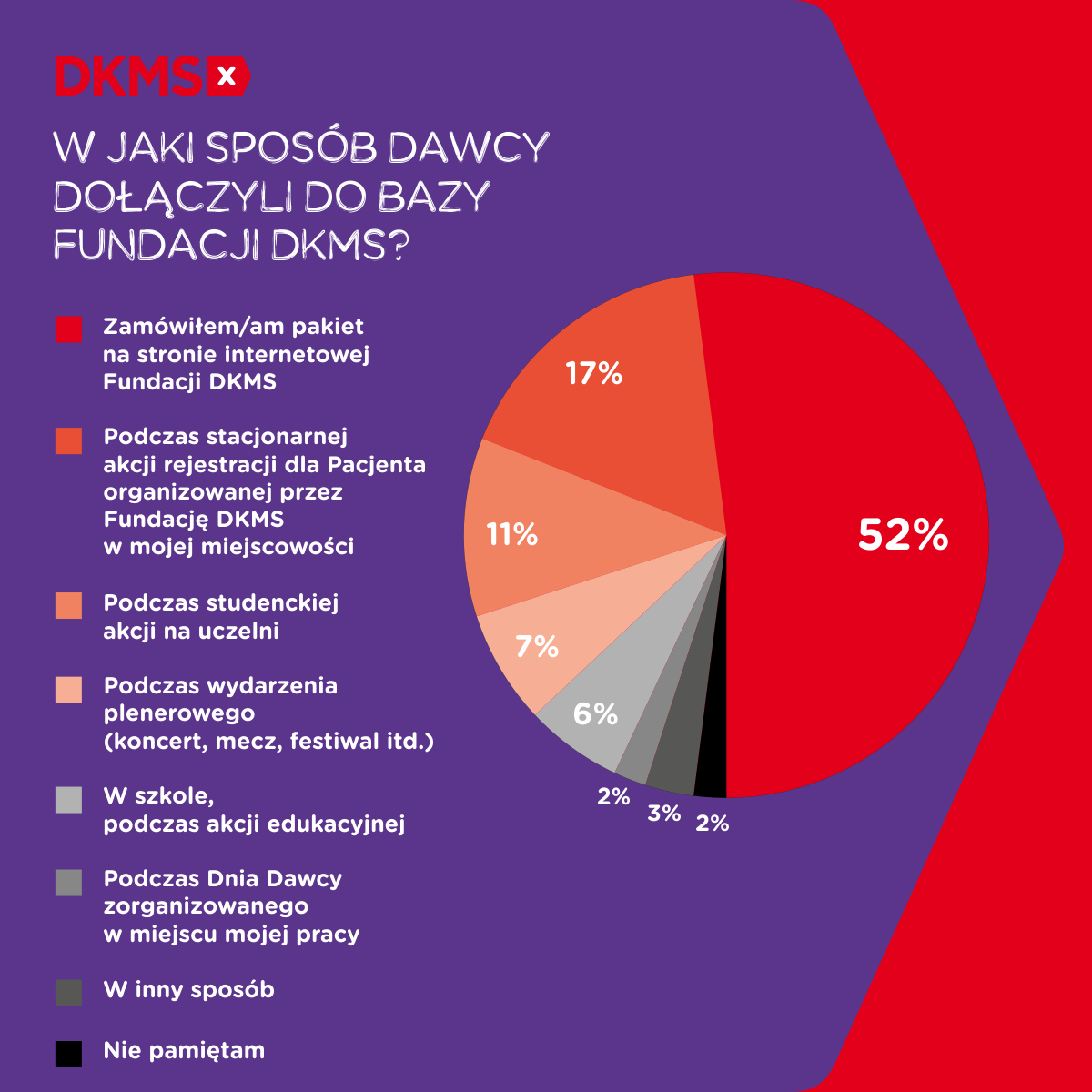 Najczęstszym sposobem rejestracji w bazie potencjalnych dawców szpiku Fundacji DKMS było zamówienie pakietu na stronie internetowej – 52 proc. Na drugim miejscu znalazły się akcje i wydarzenia organizowane przez Fundację DKMS: akcje rejestracji dla pacjenta, studenckie akcje, wydarzenia plenerowe, akcje edukacyjne w szkołach, Dzień Dawcy w pracy – łącznie 43 proc. wskazań.