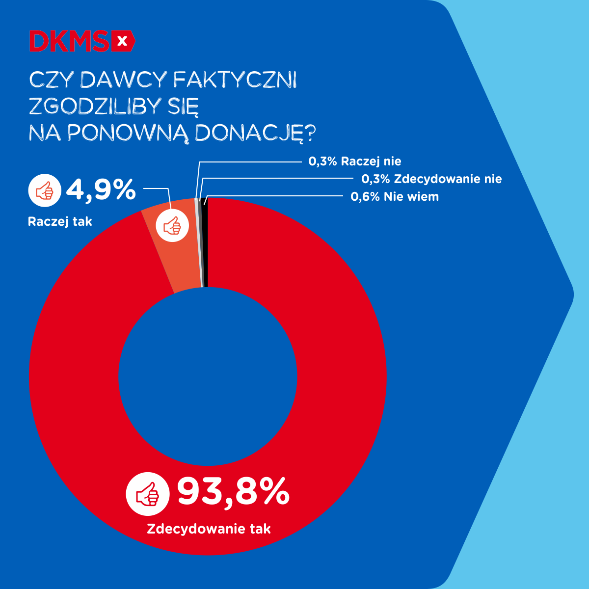 Aż 99 proc. faktycznych dawców zdecydowałoby się na ponowną donację! Głównymi powodami takiej decyzji byłyby: chęć pomocy – 51 proc., ratowanie życia drugiej osoby – 27 proc. 15 proc. dawców faktycznych stwierdziło, że oddanie komórek macierzystych lub szpiku nic ich nie kosztuje, a 10 proc. dawców traktuje tę decyzję jako odpowiedzialność i obowiązek – szczególnie, gdy sytuacja dotyczy już raz wspartej osoby.