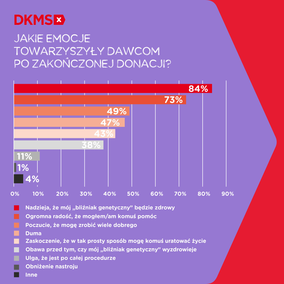 Dawcy zapytani o emocje, jakie towarzyszyły im po zakończonej donacji, wskazywali najczęściej nadzieję na to, że ich „bliźniak genetyczny” wyzdrowieje – 84 proc. oraz radość wynikającą z pomocy osobie potrzebującej – 73 proc. Prawie połowa dawców faktycznych miała poczucie, że może zrobić wiele dobrego (49 proc.), a 47 proc. odczuwało dumę. 43 proc. badanym było zaskoczonych, że w tak prosty sposób może uratować komuś życie.