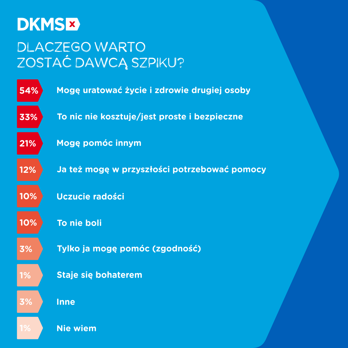 Na koniec dawcy faktyczni zostali poproszeni o dokończenie zdania, w którym mieli napisać, dlaczego warto zostać dawcą. Najwięcej odpowiedzi dotyczyło ratowania życia i zdrowia drugiej osoby – 54 proc. Co trzeci dawca napisał, że zabieg ten „nic nie kosztuje”, ponieważ jest prosty i bezpieczny, a nieco ponad co piąty podkreślił możliwość niesienia pomocy innym. Wśród odpowiedzi znalazło się również poczucie mocy/bohaterstwa.