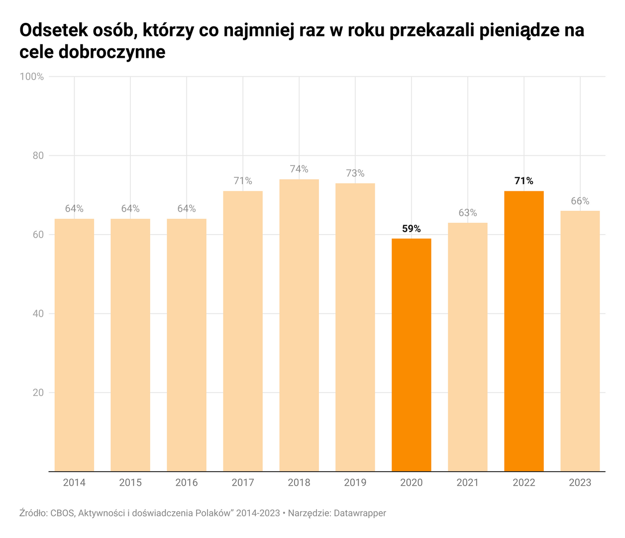- średnio ⅔ Polek i Polaków wspierało cele dobroczynne. Odsetek ten wahał się od 59% do 74%.