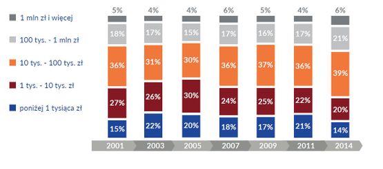 O poprawie sytuacji finansowej świadczą nie tylko większe przeciętne przychody organizacji, ale także zmniejszenie udziału organizacji o najmniejszych budżetach (do 1 tys. zł) z 20% do 14% oraz wzrost odsetka stowarzyszeń i fundacji dysponujących rocznymi przychodami powyżej 1 mln zł. Stanowiły one w 2014 roku 6% całego sektora, czyli o 2 punkty procentowe więcej niż trzy lata temu. Wykres 1. obrazuje zmiany struktury przychodów sektora pozarządowego od 2001 roku.