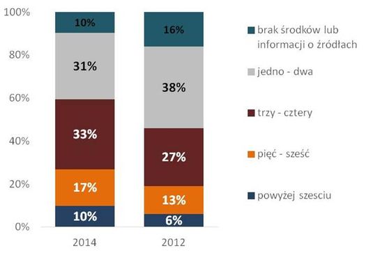 Ważną zmianą, którą można odnotować, porównując wyniki badań sektora organizacji pozarządowych z lat 2012 i 2015, jest wzrost liczby źródeł przychodu. Budżet przeciętnej organizacji w 2011 roku pochodził z dwóch źródeł, czy raczej kategorii źródeł (por. kategorie wymienione na wykresie 4), a w roku 2014 już z trzech. Budżet składający się z wpływów z pięciu lub więcej typów źródeł mało w 2014 roku 27% organizacji, a w 2011 roku 19%.