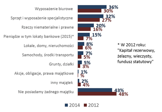 43% organizacji nie dysponuje żadnym majątkiem. Dobra, będące w posiadaniu stowarzyszeń i fundacji, to najczęściej przedmioty i dobra niematerialne używane w codziennej pracy, takie jak wyposażenie biurowe (36% organizacji), sprzęt i wyposażenie specjalistyczne (np. sprzęt sportowy, rehabilitacyjny, medyczny, reflektory), sprzęt edukacyjny, instrumenty muzyczne (32%), oprogramowanie komputerowe, licencje, patenty, prawa autorskie (20%).