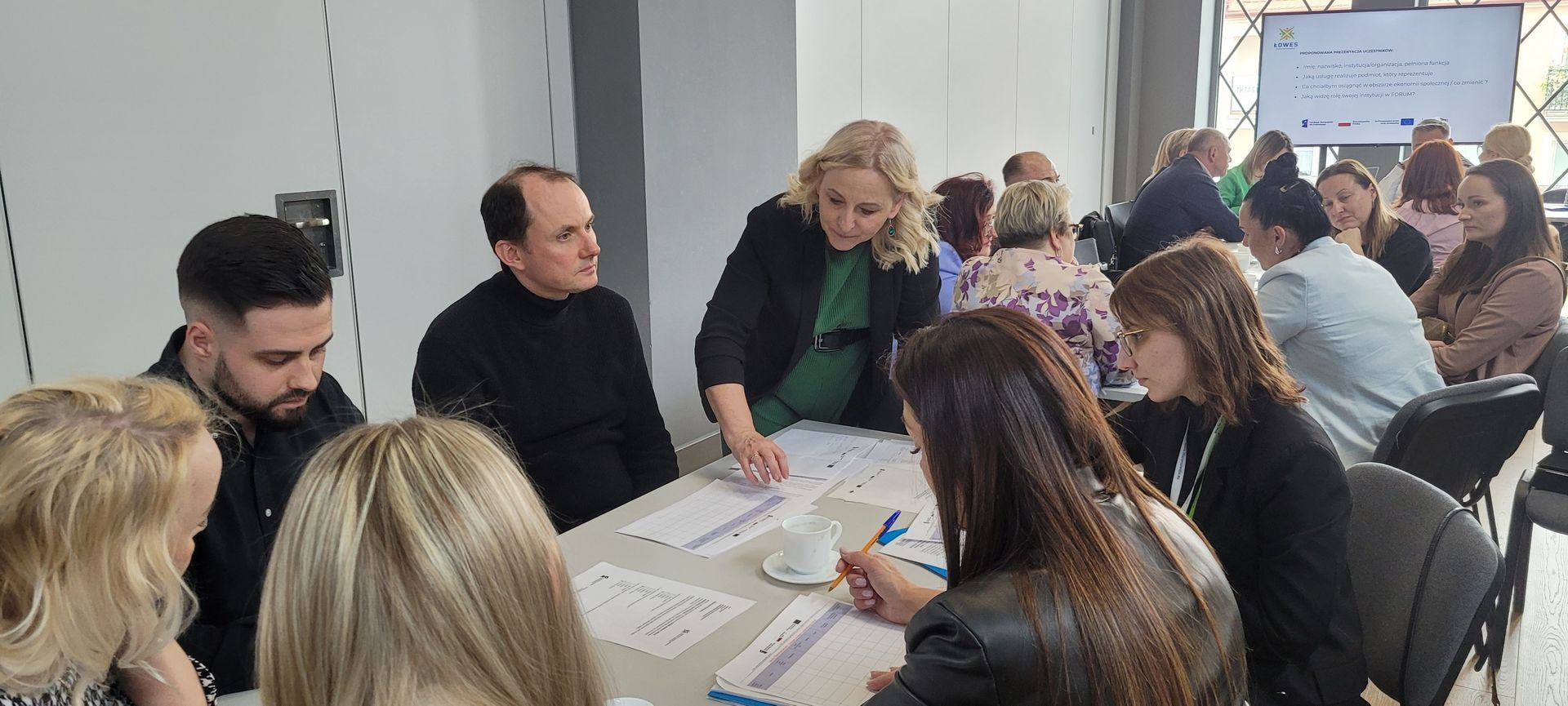 Po przerwie kawowej odbyła się druga część spotkania, której celem było zainicjowanie sieciowania podmiotów działających w obszarze usług społecznych. Uczestnicy pracowali warsztatowo przy stolikach, tworząc listę usług możliwych do wymiany i stanowiących potencjalną bazę dla współpracy. Równocześnie prowadzona była moderowana dyskusja nad projektem regulaminu Forum oraz deklaracją przystąpienia. Spotkanie pozwoliło na wypracowanie wspólnych rekomendacji i określenie kierunków dalszych działań.