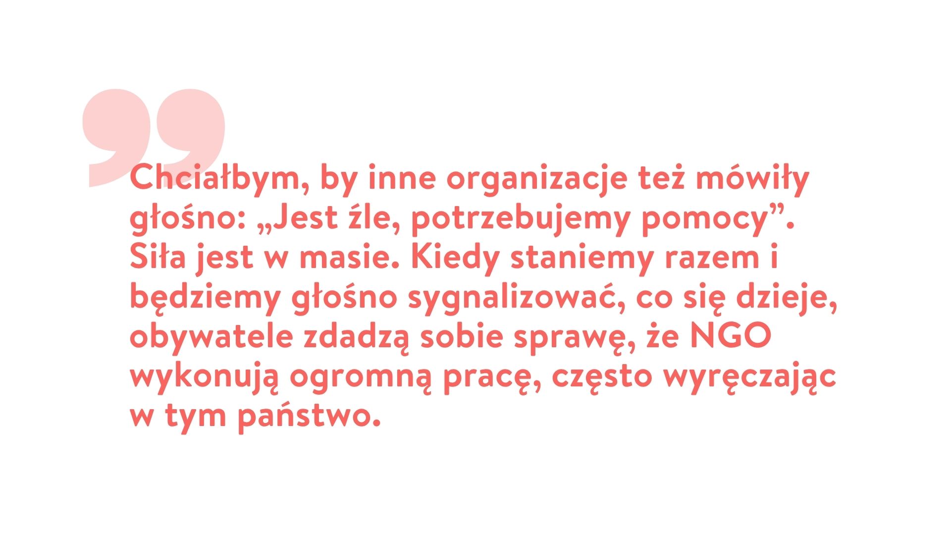 R.H: – Zawsze zachęcam organizacje pozarządowe, żeby głośno mówiły o swoich problemach. Nie chowajcie głowy w piach. Czasem fundacje myślą, że jeśli nie będą się skarżyć, to będzie im łatwiej i bezpieczniej. Nie będzie. Wiemy o dużych organizacjach, które mają problemy, ale nic o tym nie mówią, licząc, że jakoś to będzie. Kiedy nam ucięto finansowanie, uderzyłem w stół. Chciałbym, by inne organizacje też mówiły głośno: „Jest źle, potrzebujemy pomocy”. Siła jest w masie. Kiedy staniemy razem i będziemy głośno sygnalizować, co się dzieje, obywatele zdadzą sobie sprawę, że NGO wykonują ogromną pracę, często wyręczając w tym państwo.