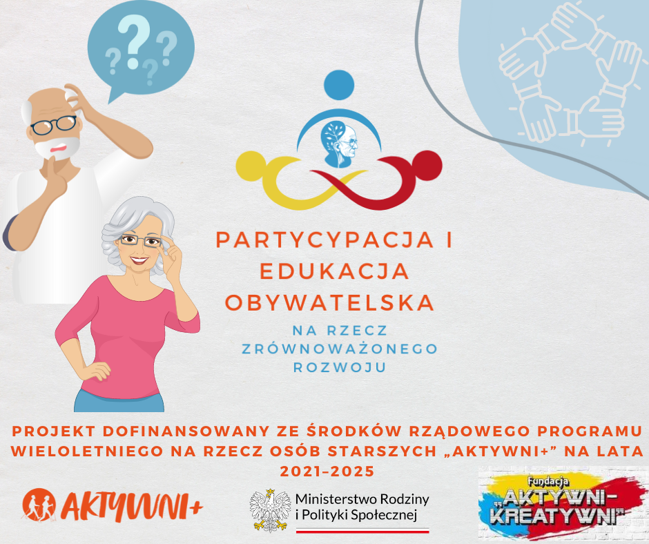 Miło nam poinformować o realizacji projektu „Partycypacja i edukacja obywatelska na rzecz zrównoważonego rozwoju” dofinansowanego ze środków rządowego programu wieloletniego na rzecz Osób Starszych „Aktywni+” na lata 2021–2025.