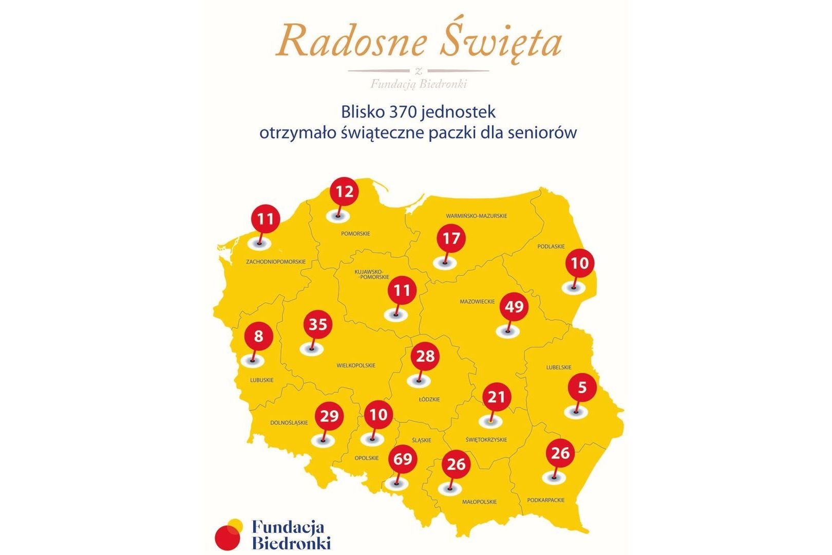 Program „Radosne Święta z Fundacją Biedronki” przeznaczony jest dla podmiotów sprawujących opiekę głównie nad seniorami, którym Fundacja Biedronki wysłała im bożonarodzeniowe prezenty. Do projektu zakwalifikowały się ośrodki z całego kraju, jednak najwięcej instytucji, które otrzymały paczki, znajduje się w województwie śląskim (19%). Z naszego województwa do programu dostało się 49 jednostek. Największy procent uczestników projektu stanowią Domy Pomocy Społecznej (54%), drugie miejsce pod tym względem zajmują Zakłady Opiekuńczo-Lecznicze (16%). Paczki dla seniorów trafiły również do mieszkańców hospicjów i schronisk dla bezdomnych.