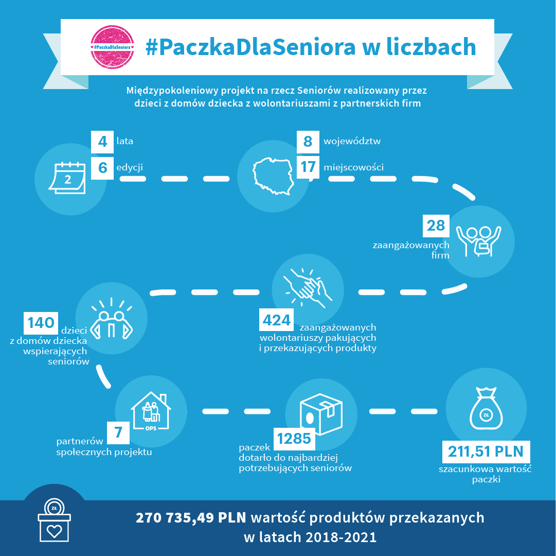 Projekt został rozszerzony na inne placówki opiekuńczo-wychowawcze będące pod opieką fundacji. Szybko zyskał zasięg ogólnopolski – #PaczkaDlaSeniora jest dziś obecna w 8 województwach i 17 miejscowościach.