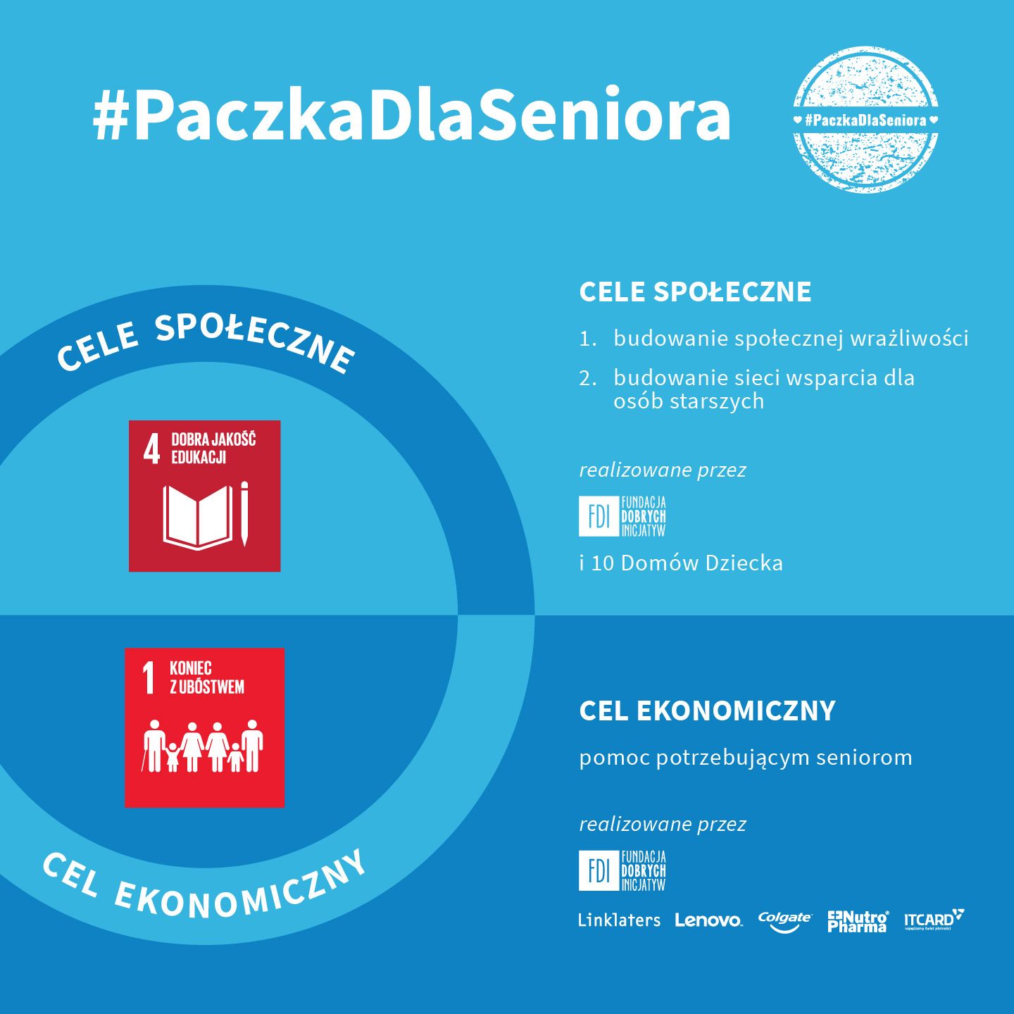 Fundacja zarządza relacjami z darczyńcami i partnerami działań w sposób elastyczny, działając tak, aby udało się rozwijać projekt, zapewniając wsparcie coraz większej liczbie seniorów, a także – umożliwiać firmom angażowanie ich zasobów (ludzkich i finansowych). Założenia projekty #PaczkaDlaSeniora wpisuje się także konkretne w Cele Zrównoważonego Rozwoju wyznaczone przez Agendę 2030 ONZ: Cel #4: Dobra Jakość Edukacji, a także Cel #1: Koniec z Ubóstwem.