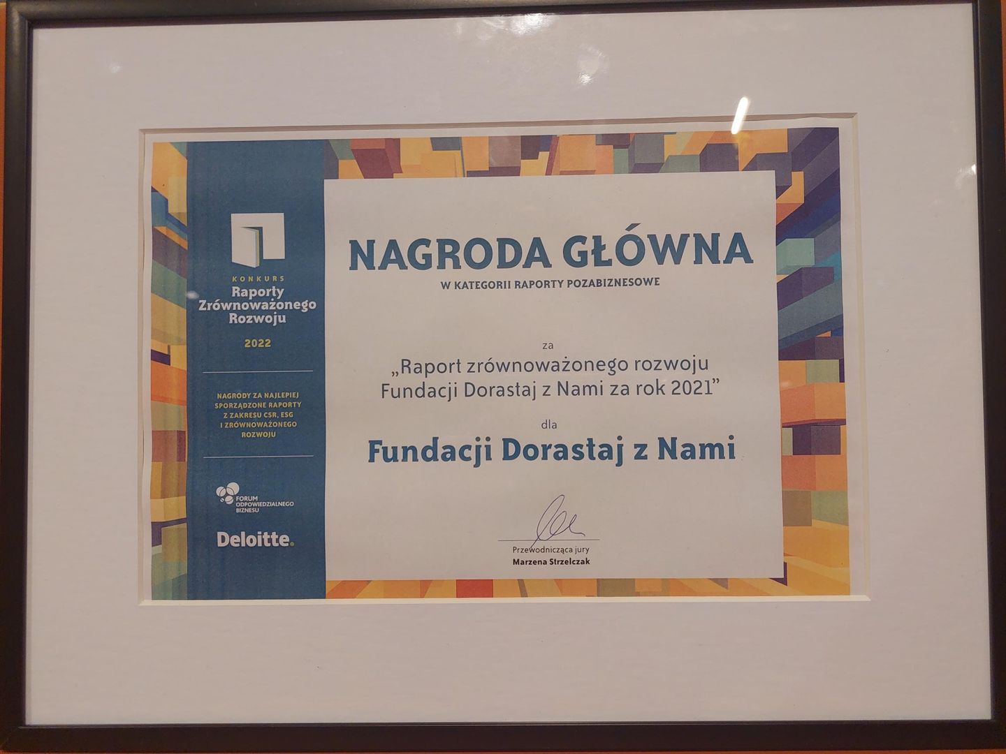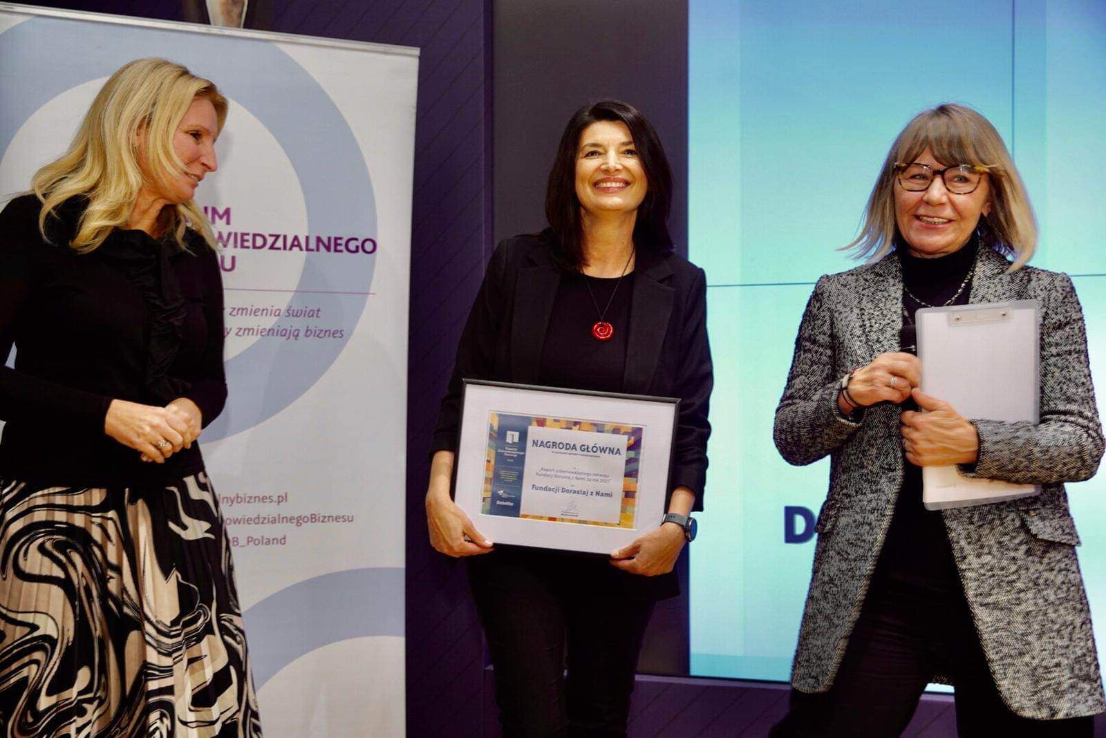 Fundacja Dorastaj z Nami zdobyła nagrodę główną za swój pierwszy Raport Zrównoważonego Rozwoju 2021 w kategorii organizacje pozabiznesowe. Konkurs już po raz 16. zorganizowały Stowarzyszenie Forum Odpowiedzialnego Biznesu i firma Deloitte.